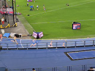 Mi piazzo a un settore dal mio posto, verso il centro, in modo da vedere l'asticella dell'alto senza che sia coperta dalla gabbia del martello. La tribuna Tevere è abbastanza piena, anche se meno di ieri mattina, c'è un po' di gente in curva Sud, quasi nessuno nel resto dello stadio, ma tutto sommato il pubblico non è pochissimo per essere una sessione mattutina, Si vedono sempre le bandiere svizzere e finlandesi, alle premiazioni si vedranno anche quelle di Gran Bretagna e Norvegia.